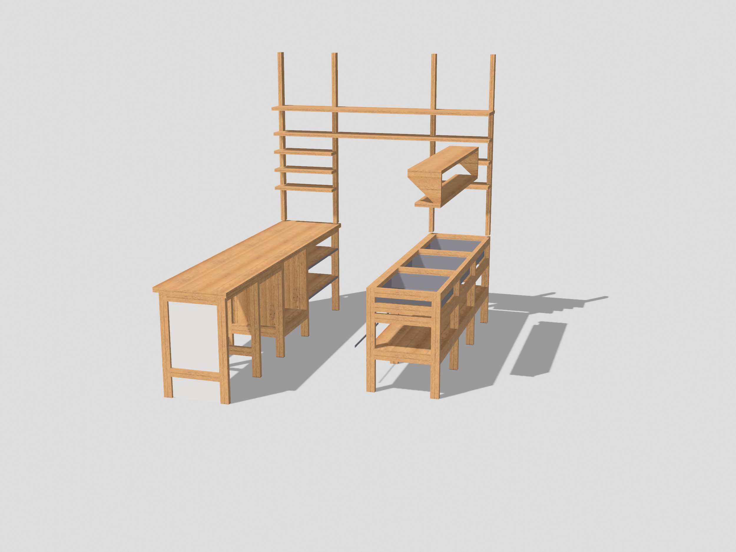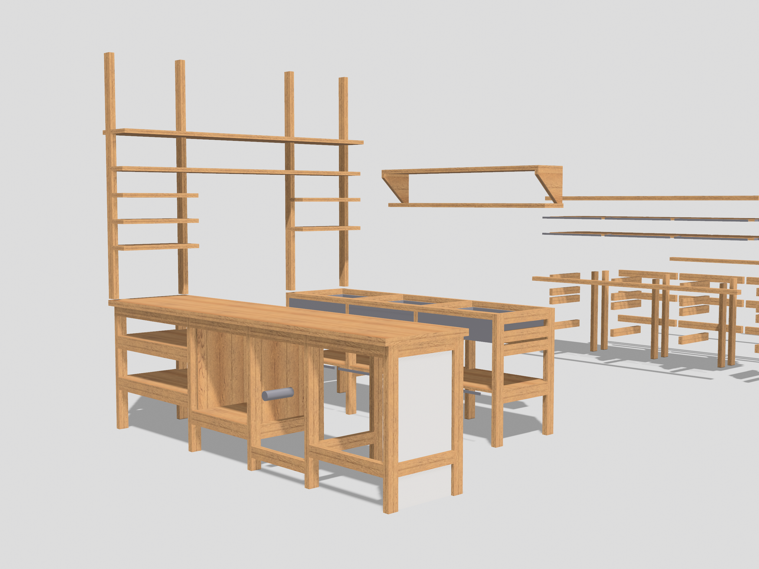 Der Gesamte Unterbau ist aus Lärche (4 x 7cm Vollholz), die Zwischenböden und Laden-Korpora (ja, das ist wohl die Mehrzahl von “Korpus”. Noch nie gehört :-) sind Lärchen 3-Schichtplatten und die Arbeitsplatten, Laden-Fronten und Regalböden sind aus Esche. Wunderschön. Die Bauweise ist offen, nur 3 Laden mit Vollauszügen und natürlich die Verkleidung für den Geschirrspüler decken den Unterbau. Wir wollten das so.