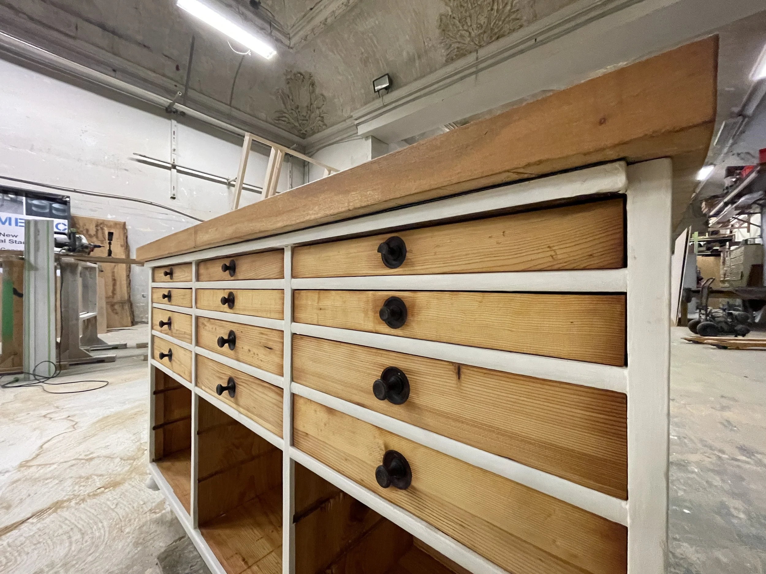 Also, hilft nicht – schleifen, schleifen, schleifen. Viel Staub, aber auch viel Freude, als alles wieder “nackt” und sichtbar wurde. Die Schubladen waren der Hammer, denn in jeder war Papier zum Schutz eingeklebt und musste leider raus. Hat ein bisschen gedauert. Dafür haben die Schubladen so schöne gedrechselte Holzgriffe, die ich alle erhalten habe. Die Rückwand kam dafür weg, die wird neu gemacht.