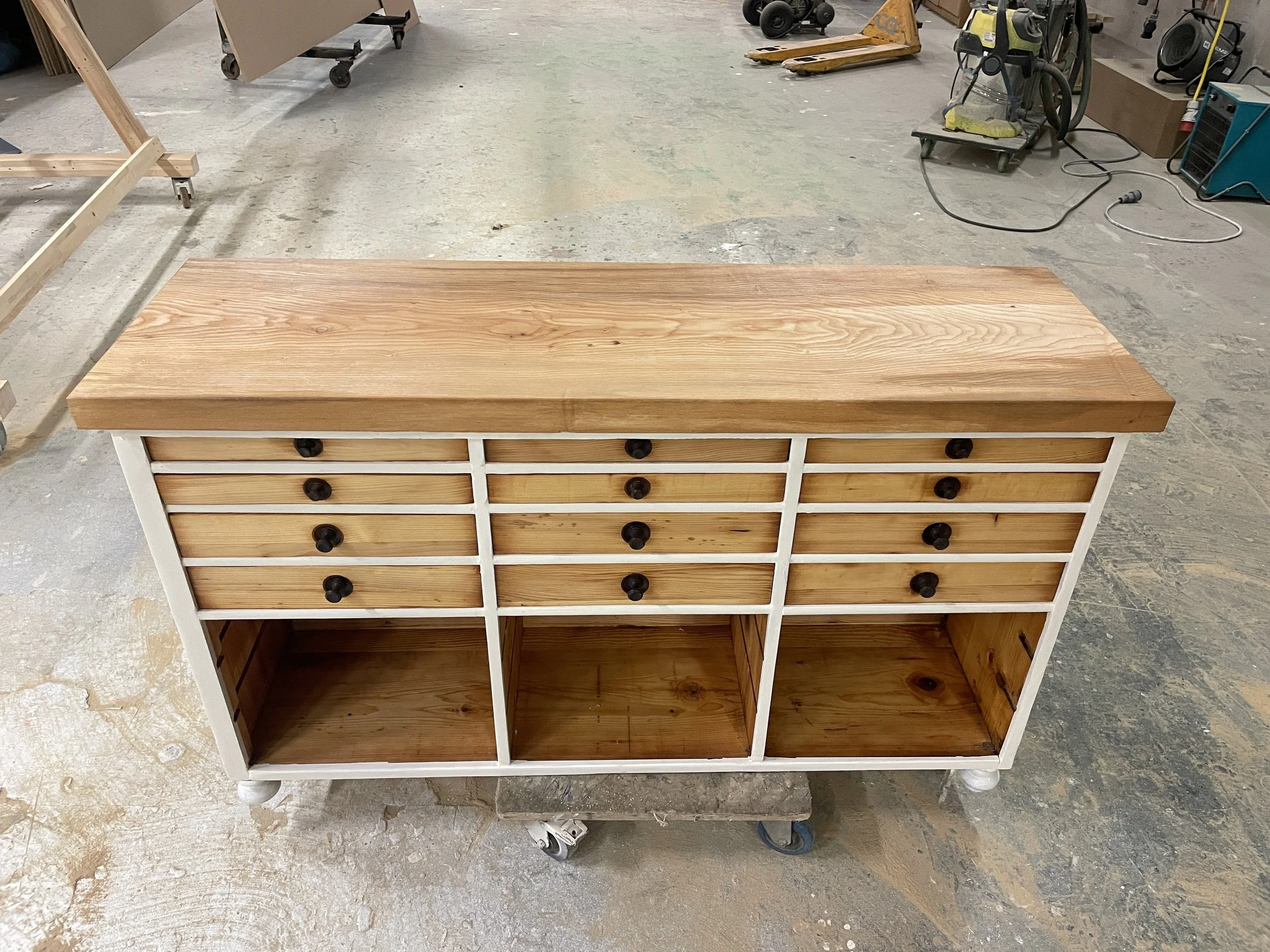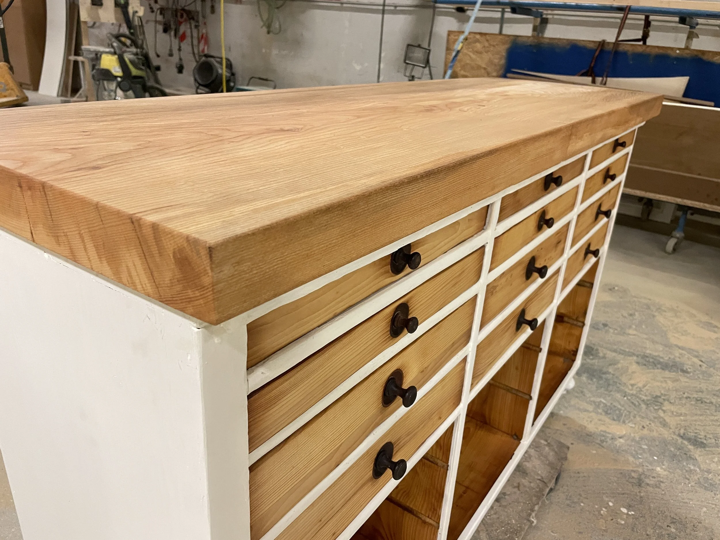 Als alles geschliffen war, brauchte ich nun eine Entscheidung über die Oberfläche. Dazu wurden mehrere Varianten getestet und: Mahagoni-Beize, weißer Antik-Lack, Antik-Wachs oder einfach Öl. War schnell klar - der Korpus wird weiß, die Laden werde ich mit einem guten Öl einstreichen und Natur lassen.
