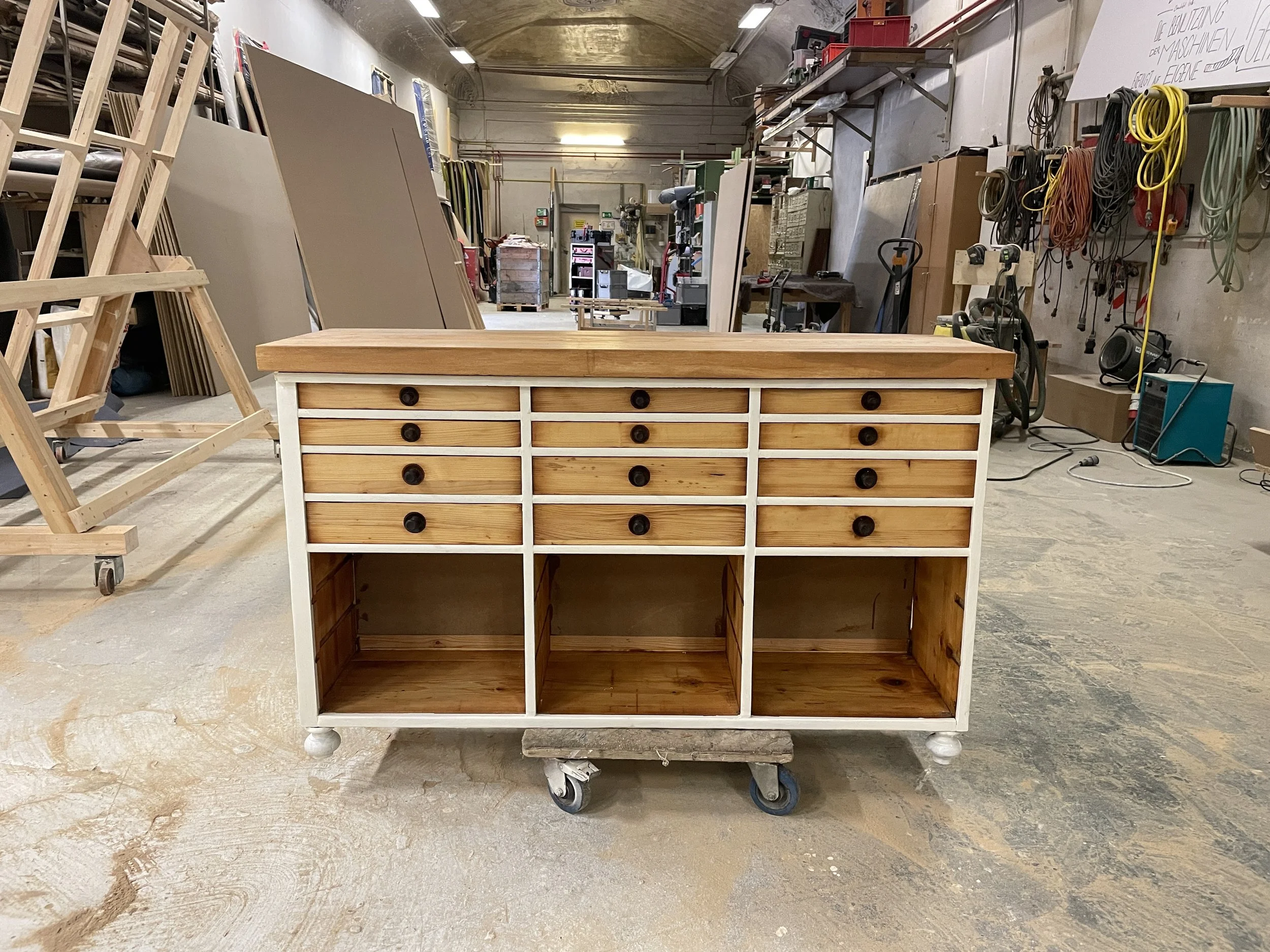 Wir haben bei einem Hausausbau ein altes Schubladenkastl gefunden, in dem offenbar Werkzeug eingeschlichtet war. Jede der Schubladen war sauber beschriftet und in den Laden waren noch Einlagefächer gebaut, damit nichts herum rutscht. Das Kastl hatte außen eine schöne Patina in Mahagoni. Leider löste sich der Lack dort und da schon ein bisschen und überhaupt war das Kastl eher etwas heruntergekommen. Herrichten oder weg damit?